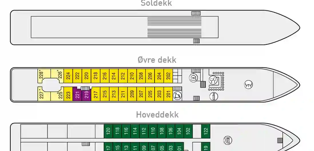 Alle lugarene er utvendige og har bad med dusj, hårtørrer, TV, safe, lite kjøleskap og aircondition. Lugarene er cirka 11 m² og har to separate senger som gjøres om til sofa på dagtid. Vinduet i lugarene på øvre dekk kan åpnes. Enkeltlugarene på øvre dekk er 9 m².