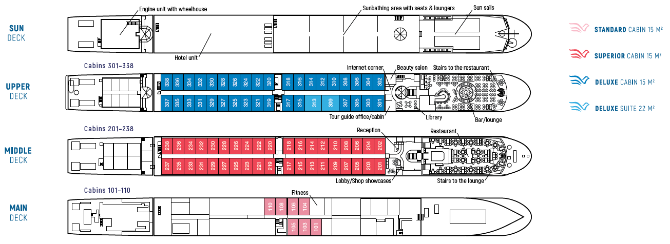 Standardlugarene på hoveddekk (Main Deck) har vinduer som ikke kan åpnes. Lugarene på midt- og øvre dekk (Middle og Upper Deck) har fransk balkong med vinduer fra gulv til tak og med en skyvedør som kan åpnes. Suitene er på ca 22 m² mens standardlugarene på ca 15 m².