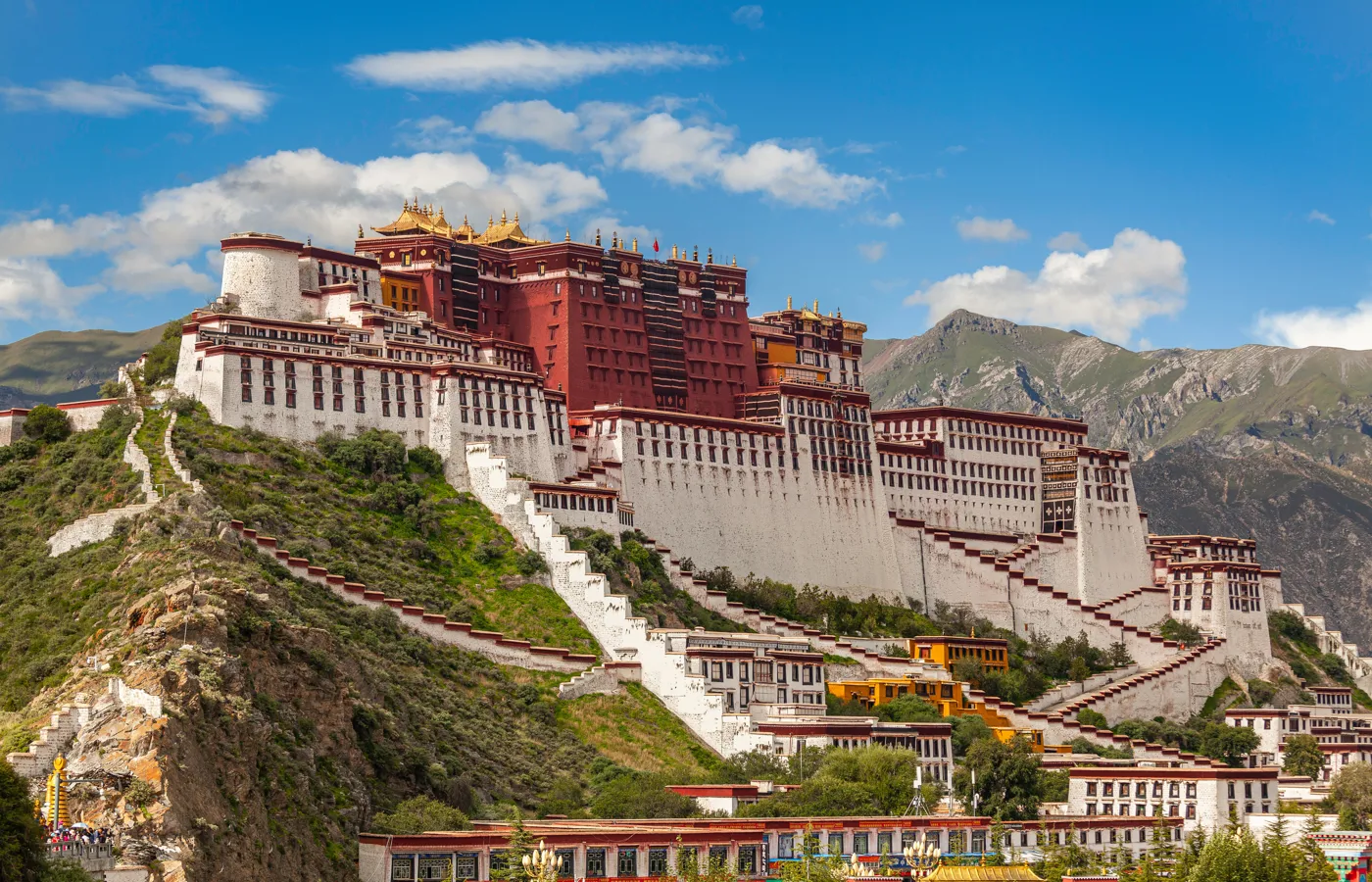 Potala-palasset ligger på Marpo Ri - "den røde klippe" - 3 700 meter over havet, en imponerende bygning med 13 etasjer og over 1 000 rom. Utsikten over Lhasa-dalen og de omkringliggende fjellene gjør besøket til en opplevelse for både kropp og sjel.