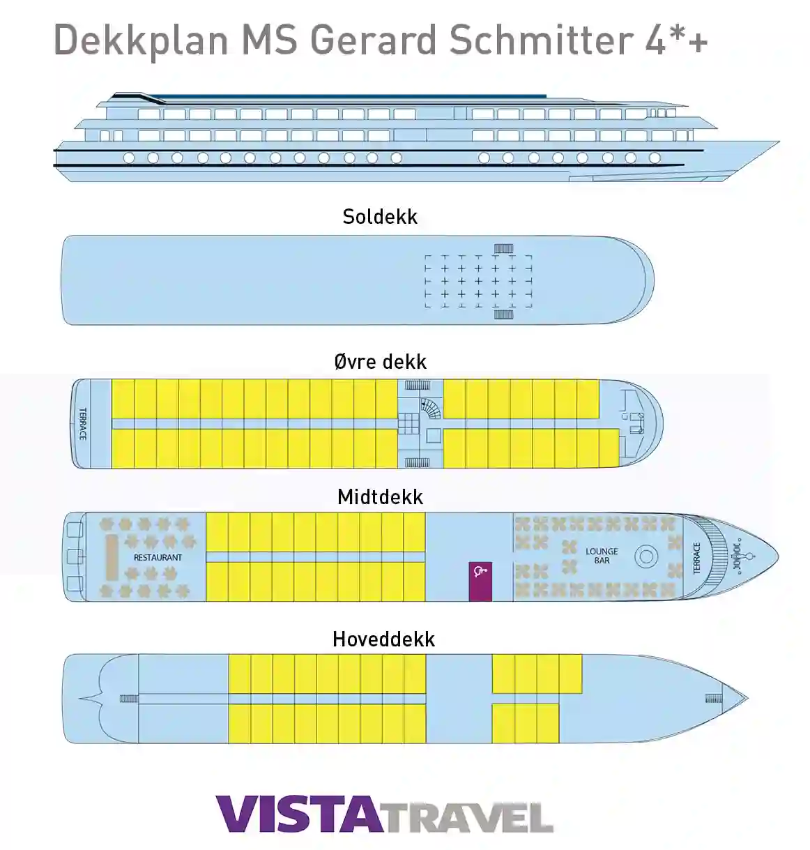 Restauranten, som ligger på midtdekket og hvor alle måltider serveres under cruiset, byr på utsøkt mat i elegante omgivelser, med store vinduer som gir gjestene panoramautsikt. På dette dekket finner du også salongen/baren med dansegulv. På soldekket, det perfekte stedet for avslapning og å beundre landskapet, kan passasjerene nyte sittegrupper og et stort, skyggefullt område.